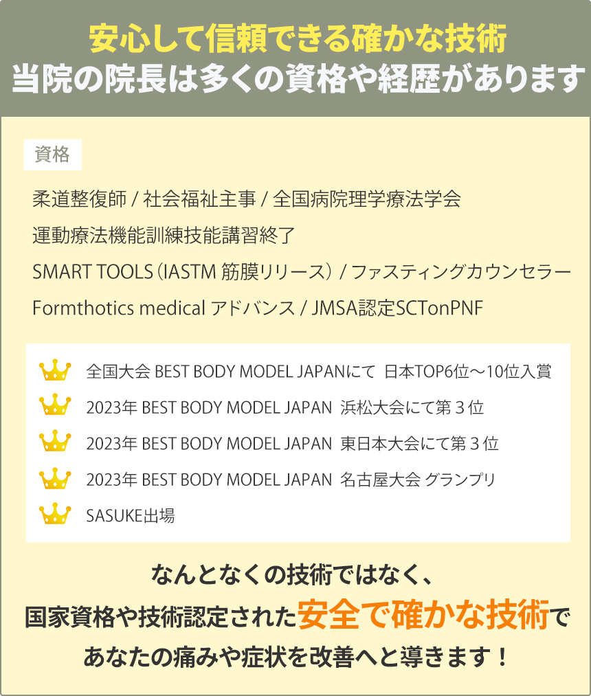 当院ではバキバキせずに「ソフトでイタ気持ちいい」施術でケガだけではなく、腰痛、肩こり、頭痛、膝の痛みなどの不調も根本改善に導いていきます。